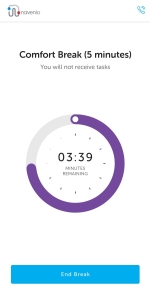 Note: 5 minutes (timing subject to system configuration) before the break is due to finish, the task handler receives a notification. If they do not end the break, a further notification advises when the initial break time has expired and the countdown clock displays the accrued negative time. The task handler's status remains "On a break" and tasks are not assigned to them until the break has been ended.