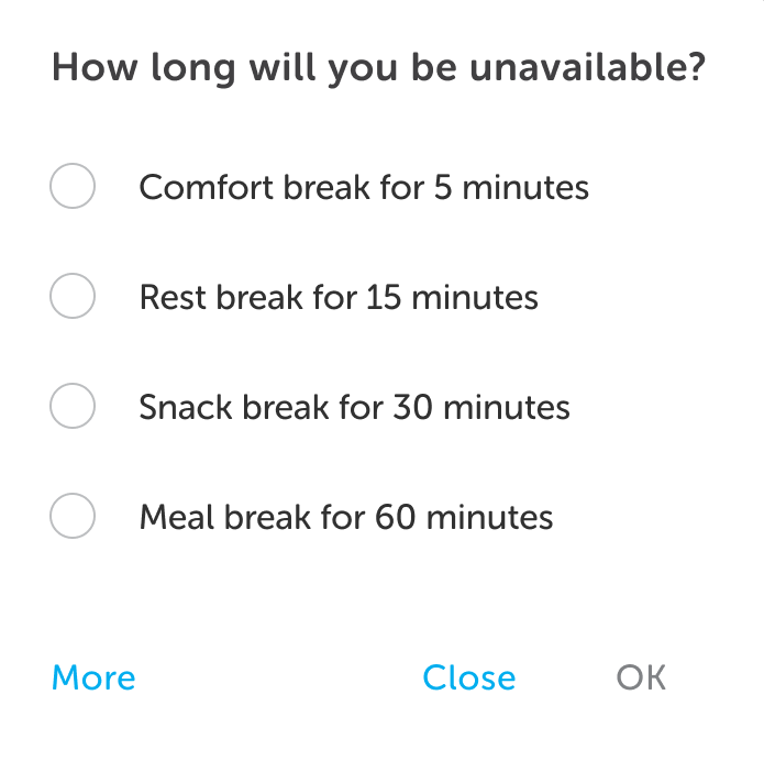 If the task handler is going on a break, the task handler can tap On a break to update their status. Tasks are not assigned for the duration of the break.