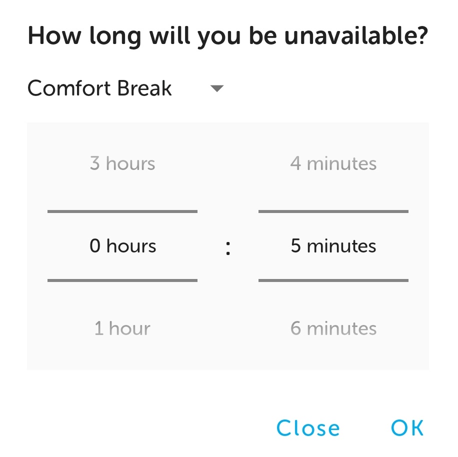 From the drop-down (displays Comfort break), select the type of break and then set the duration of the break. Tap OK.