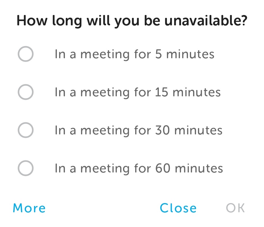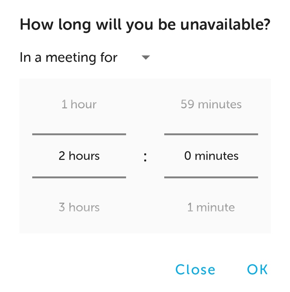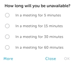 When the option, In a meeting, has been tapped, a dialog box is displayed to set the length of the meeting.