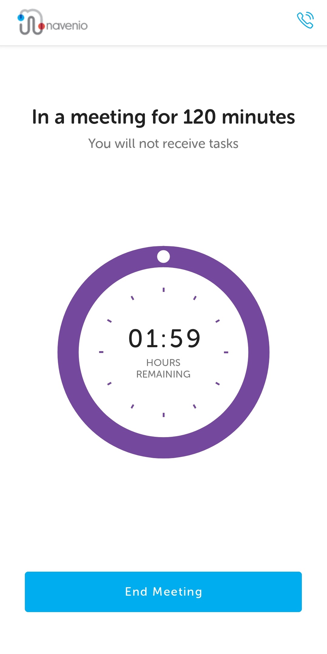 Note: 5 minutes (timing subject to system configuration) before the meeting is due to finish,, the task handler receives a notification. If they do not end the meeting, a further notification advises when the initial meeting time has expired and the countdown clock displays the accrued negative time. The task handler's status remains "In a meeting" and tasks are not assigned to them until the meeting has been ended.