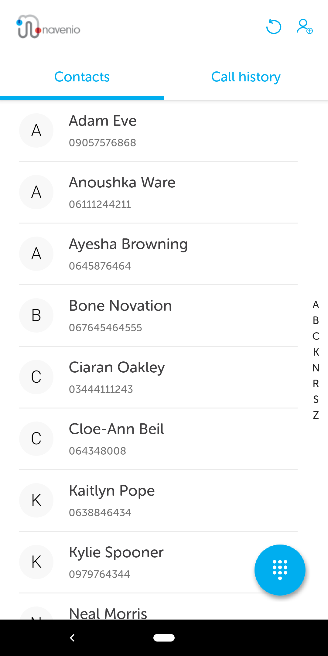 To access the contact list, tap the call button on the top of any screen to display the dialler page. Tap the contacts