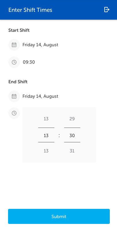 Note: The Shift End time cannot be set in the past. If a time is selected in the past the Submit button is greyed out and an error message displayed. The shift end time must be amended before continuing.