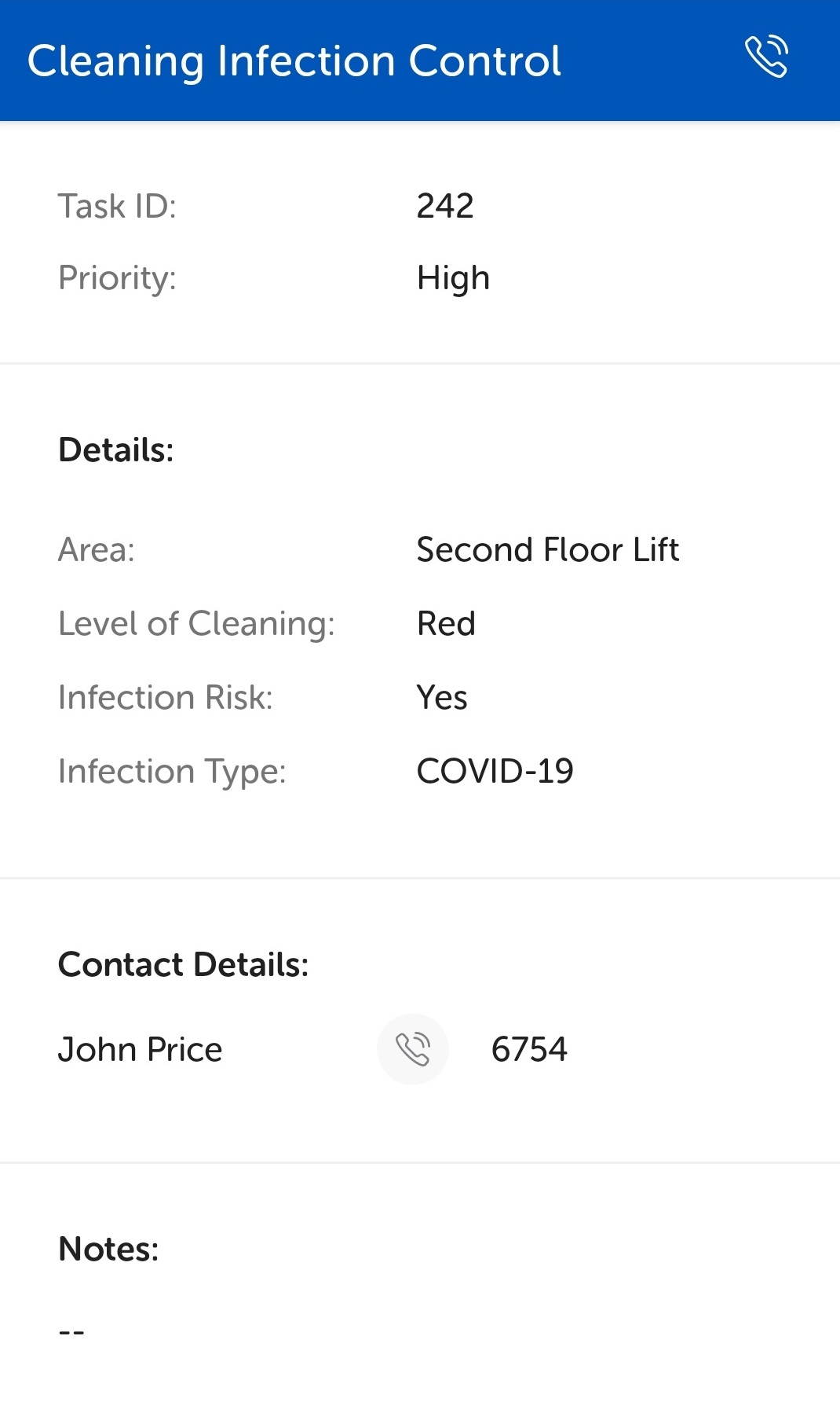 Having tapped the blue task assigned button, the task details display. Scroll down to view all the details that have been added to the task.