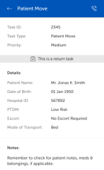 A task type, e.g., a patient move, can be configured to allow a Return Task to be generated from it once an outbound task of this type has been completed. A Return Task, with the same details but the waypoints in reverse order, can be generated to return the patient back to where they came from.