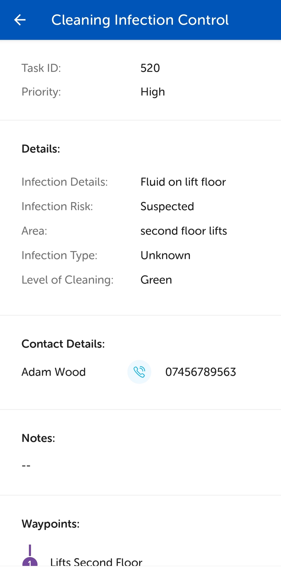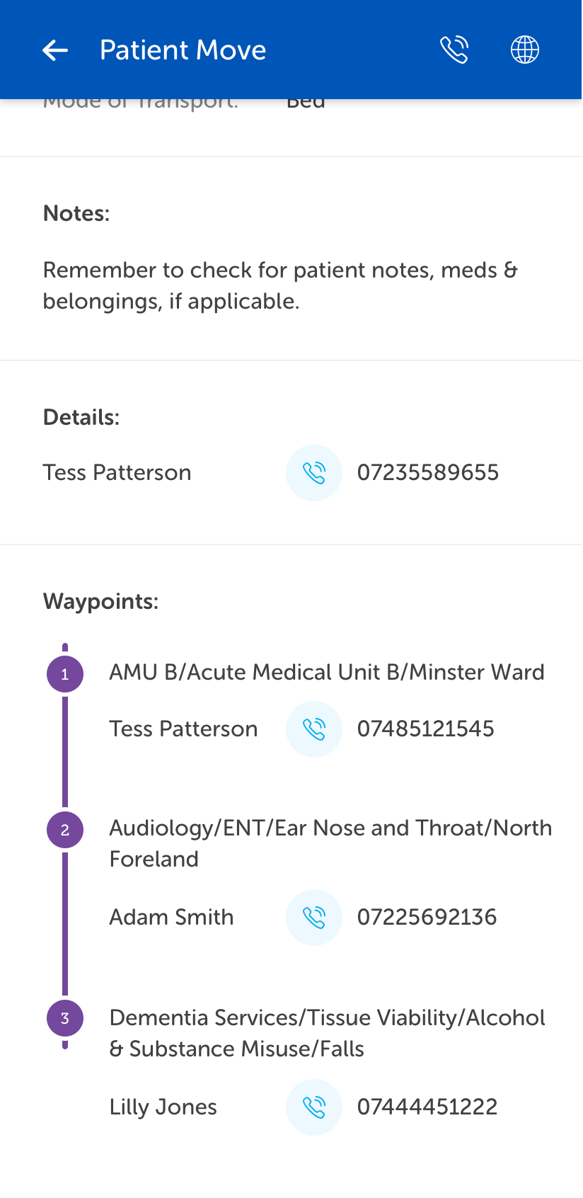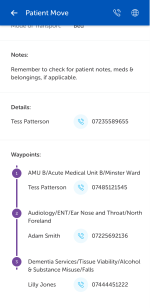 Calls to any other contact, for example, waypoint contact or assistant task handler, can be made by tapping the call button adjacent to their name.