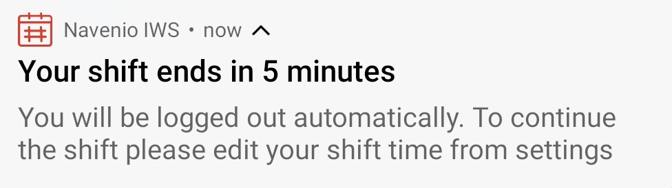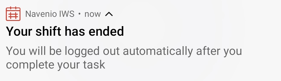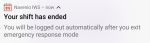 In a meeting, on a break, on an adhoc request or on an emergency response - The IWS Mobile app displays the notification that the shift has ended. When the meeting, break, adhoc request or emergency response has ended, the IWS Mobile app logs out automatically.
