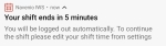 Ready for work - As the end of shift time approaches, if the current status is "ready for work", the IWS Mobile App displays a message to advise that the current shift ends in 5 minutes.