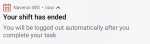On a task - The task must be completed. The IWS Mobile app displays a notification that the shift has ended. When the task has been completed, the IWS Mobile app automatically logs out.