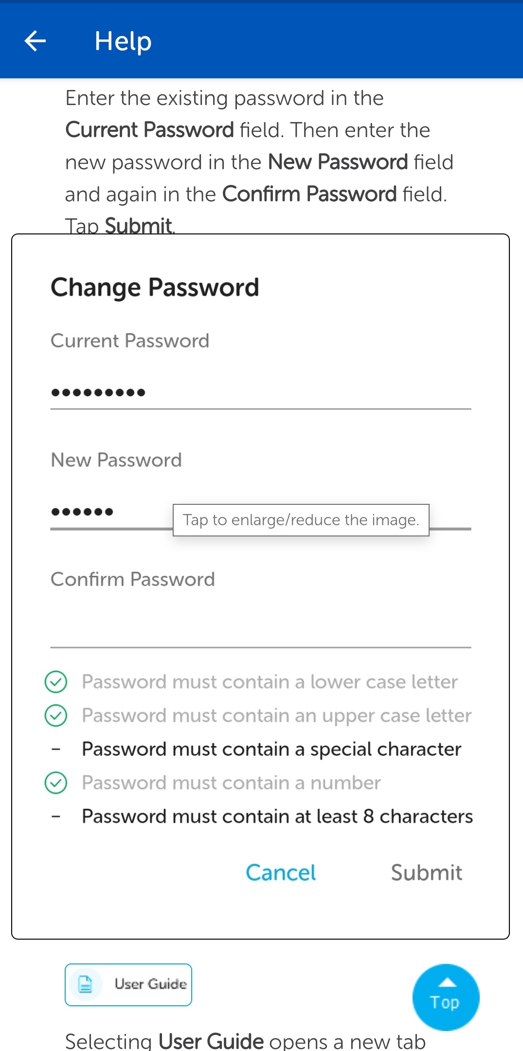 Instead of using the menu, the Search field produces a list of topics that include a key word. Enter the relevant key word in the Search field and tap the search tool. Tap on the appropriate topic from the resultant list of topics to view the topic in full.