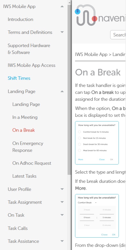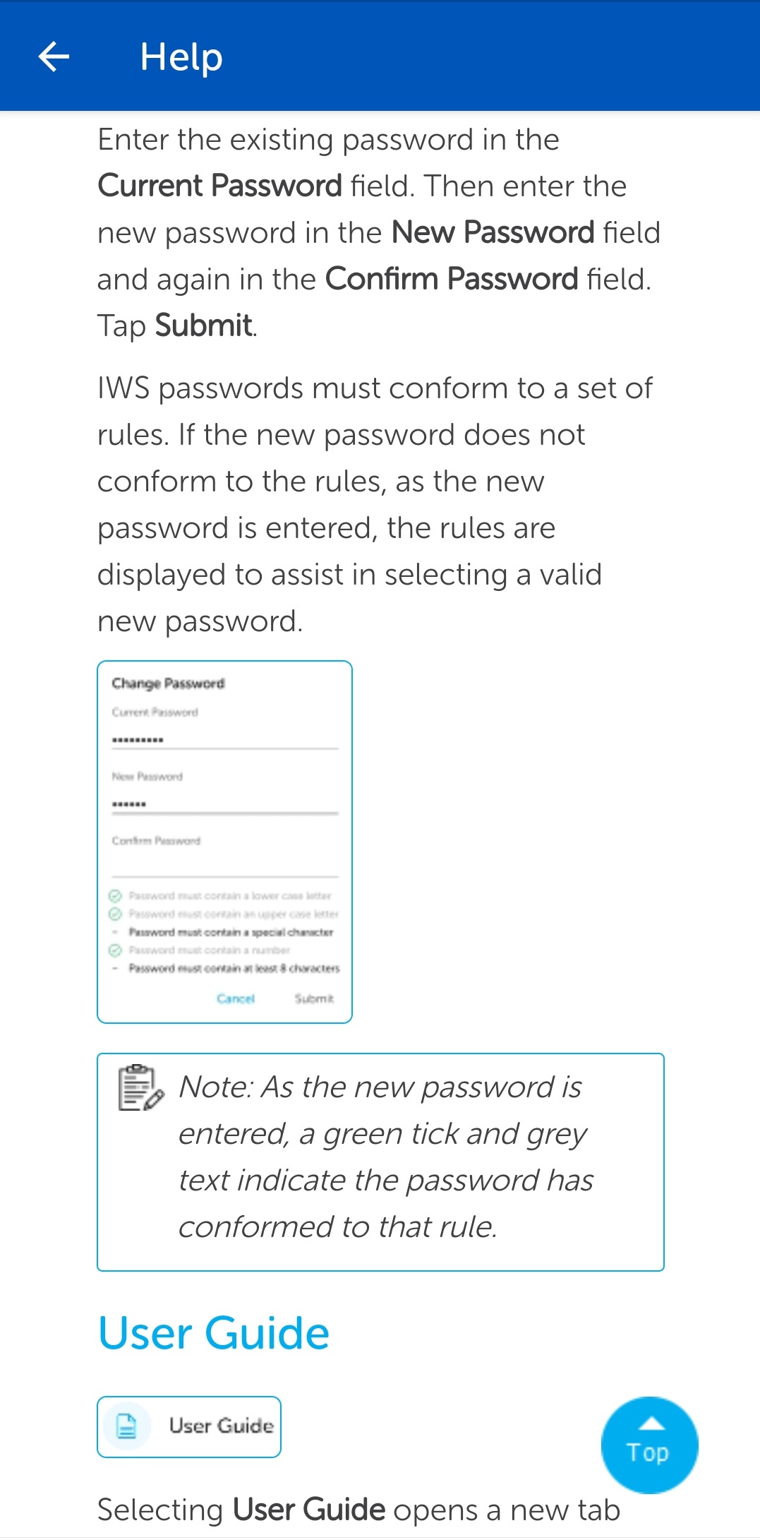 option opens a new tab and displays the IWS Mobile App and IWS Portal user guides.